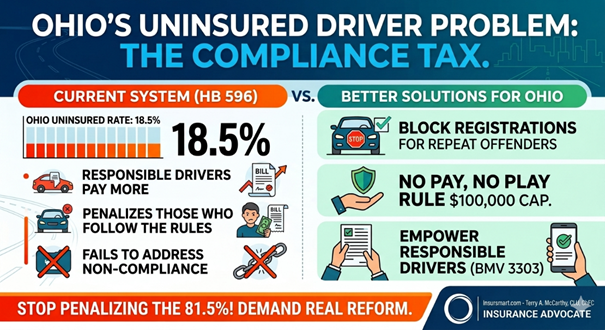 Nearly 1 in 5 drivers on Ohio roads has no insurance—18.5% according to the latest 2025 Insurance Research Council data. While House Bill 596 is marketed as a “safety net,” a technical analysis reveals it to be a “compliance tax” that penalizes the responsible to subsidize the lawless. It is a lazy effort that refuses to confront the root of the problem.